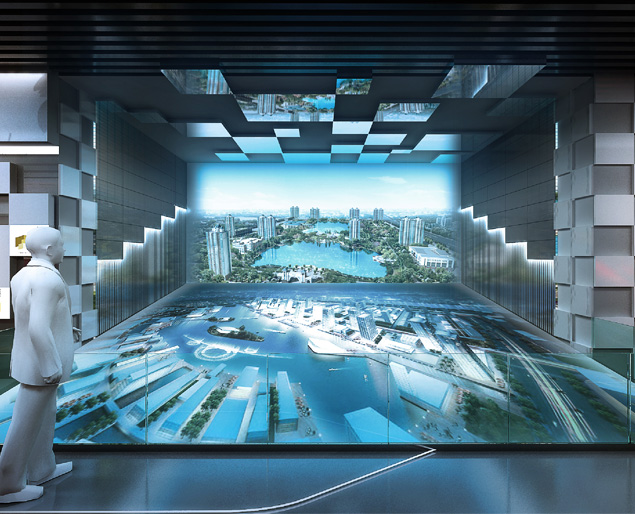 融合了多項多媒體技術突破了模型的局限,將投影影像精確投影到實體模型的相應位置,與實體沙盤互動展示的演示相映成輝,使沙盤的演示效果更加形象、生動。